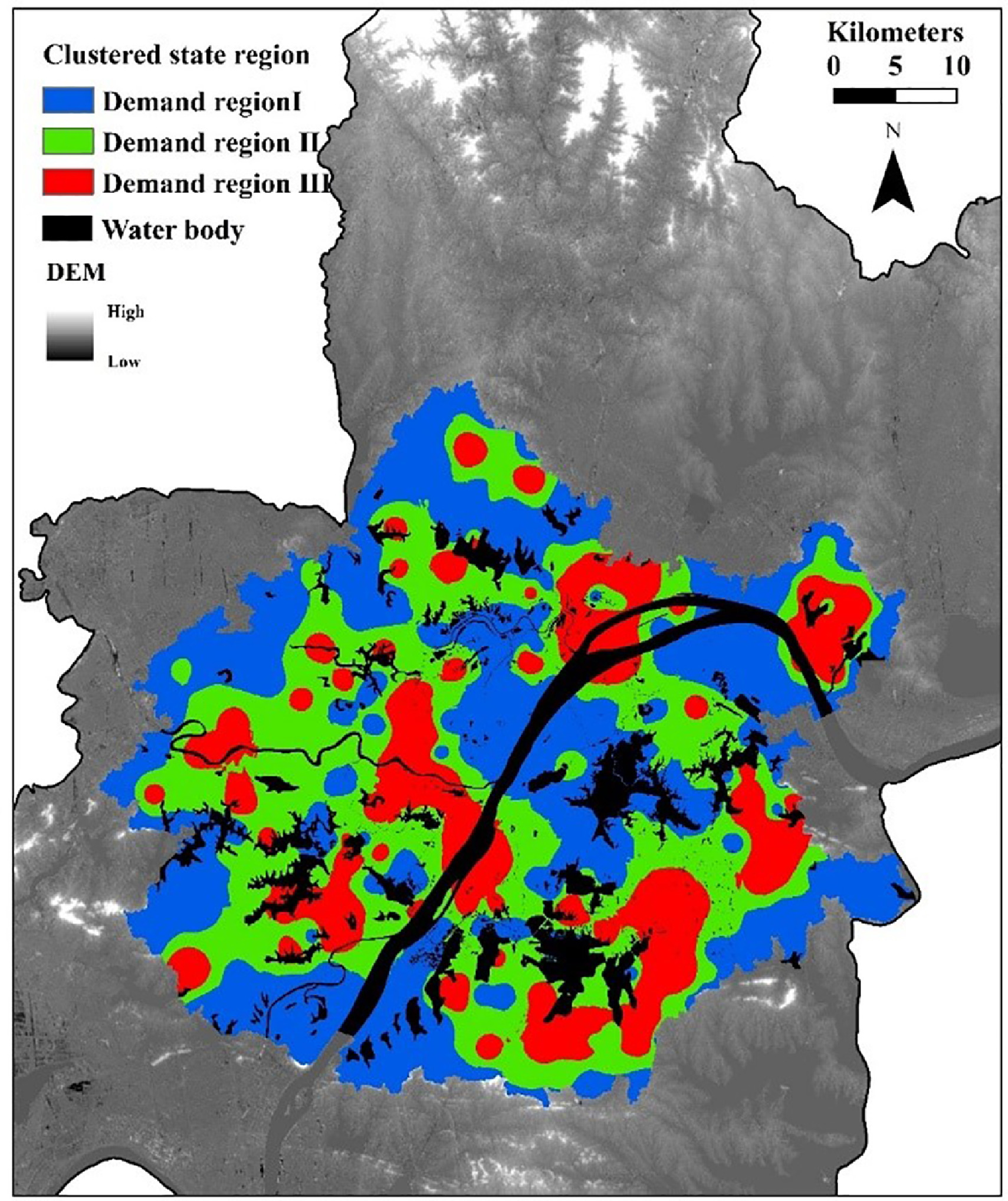 区域多角度压力协同作用状态可通过压力聚类来识别,每个需求区域内对环境、经济、生态压力的调控优先等级有所差别。区域状态的分布呈现出显著的空间异质性。压力的量化提供了多方面调控需求比较的可能性。每个区域对应一种环境、经济、生态压力权重的组合情况,从而有针对性地提出径流控制基础设施的建议方案。