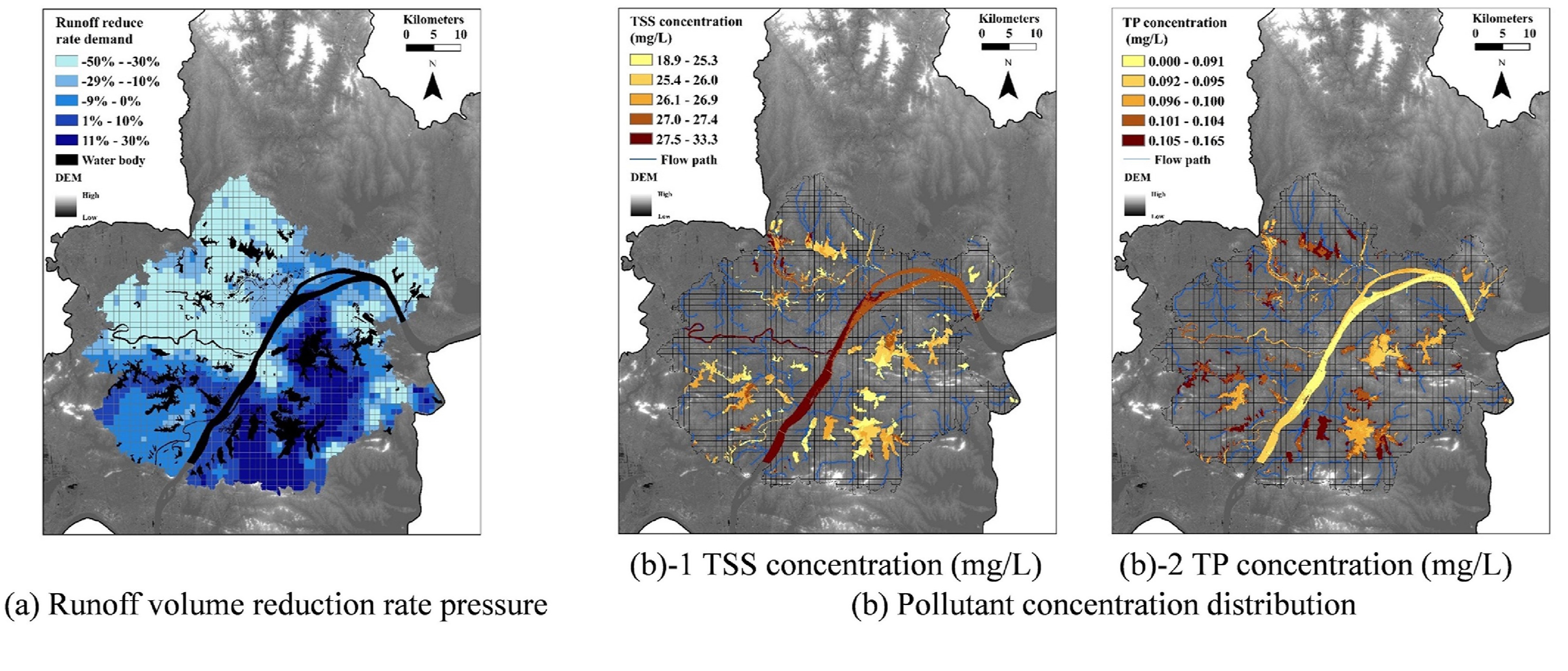在应对洪水、资源枯竭和生态退化等威胁时,需要平衡生态环境安全、城市发展和区域的自然禀赋。绿色和灰色径流控制基础设施的效益在应用过程中从环境角度扩展到经济和生态角度,并且基础设施的适应性具有高度的本地化特征。因此,区域面临的环境、经济、生态多方面压力具有高度协同性和复杂性,仅通过管理者的主观偏好来识别区域压力的优先缓解策略可能与实际情况相违背。针对性的径流控制基础设施空间布置决策能够有效缓解区域面临的多方面压力。基于此,研究团队首先量化识别了区域在环境、经济、生态方面压力的空间异质性,然后研究了多压力协同作用区域并分析不同区域中的压力缓解权重,最后依据权重制定不同区域的径流控制基础设施差异化比选方案,由此实现了径流控制基础设施的适应性空间布置决策。