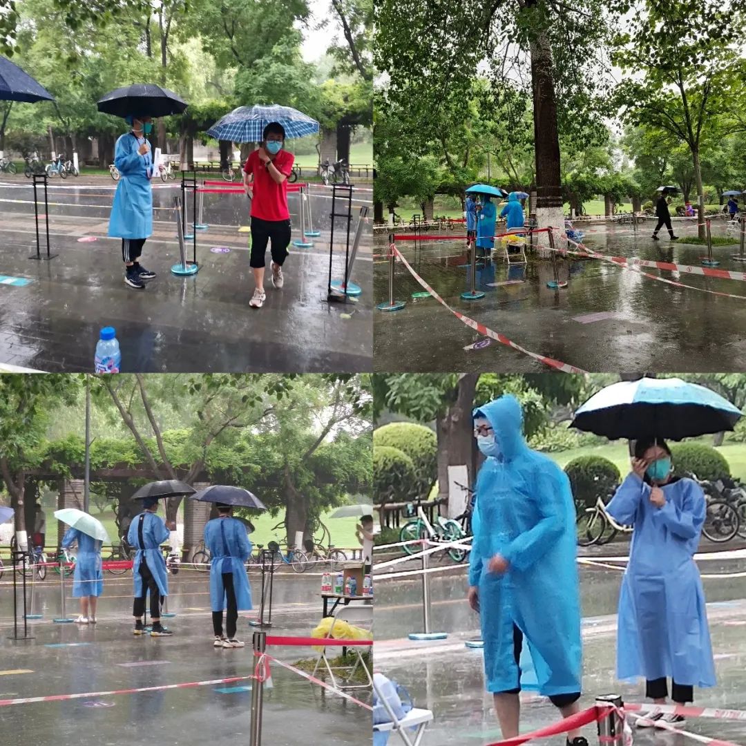 风雨之中显担当,紧要关头同聚力。在志愿工作进行到一半时突然有要下雨的征兆,为了保证核酸检测工作的有序开展,党支部成员在下雨前及时向其他检测点借来了雨具,环硕201班的其他同学也纷纷向现场工作的支部成员提供了自己的雨伞。提前的应急措施充分保障大家全身心地投入工作。顷刻间,大雨倾盆而下,许多同学匆忙来到核酸检测点。为防止现场混乱,支部成员快速调整了工作模式,加强了入口和道口的指引。尽管大雨瓢泼,却依旧没有阻挡支部成员不畏艰难、同心合力地保障核酸检测工作顺利进行。雨水打湿了一双双鞋,却不能浇灭支部党员和积极分子冲锋在前、共同抗疫的火热决心。