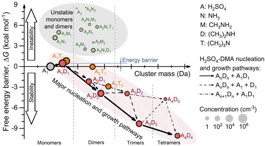 在多种污染物并存的复杂大气环境中,碱性较强且浓度较高的气体分子更容易与气态硫酸分子结合生成酸碱双分子团簇。研究团队对测到的碱性气体进行了热力学和动力学表征,发现以二甲胺为代表的有机胺是生成酸碱双分子的关键碱性分子,而氨气等弱碱性气体则更可能参与后续团簇生长过程(图5)。在这些碱性气体的帮助下,气态硫酸转化为新粒子只需要跨越一个很低的能垒,进而实现了接近于硫酸碰撞动力学极限(理论最大值)的高新粒子生成速率。