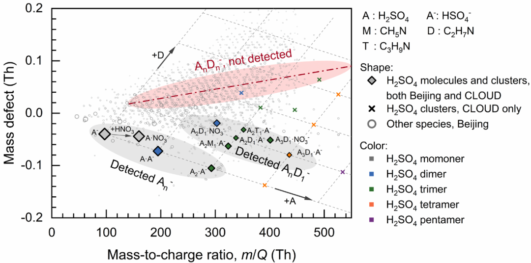 研究团队却发现,气态硫酸和含硫酸团簇的组分的测量不可避免地存在偏差。原本存在于含硫酸团簇中的碱性分子很有可能在荷电等测量过程中丢失,从而呈现酸多碱少的假象。更重要的是,不完整团簇组分的背后可能隐藏着新粒子生成的关键团簇和关键机制。