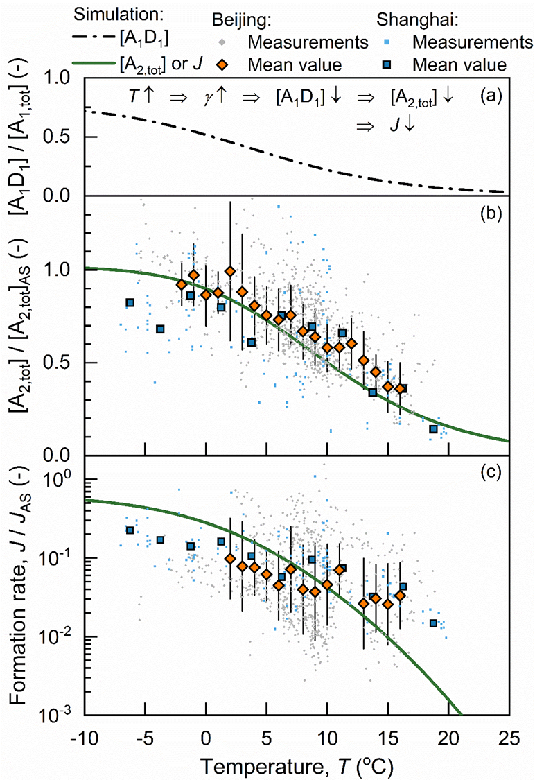 图4 温度对新粒子生成的影响。(a)酸碱双分子团簇比例;(b)含两个硫酸分子团簇浓度;(c)新粒子生成速率