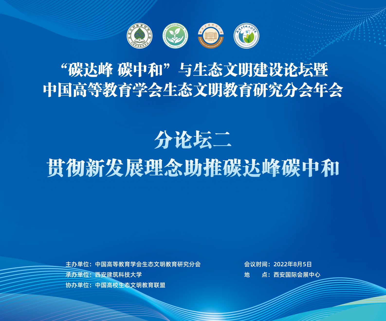 william威廉中文官网2022年8月9日电(通讯员 胡雯 姜爱娜)8月5日下午,“贯彻新发展理念助推碳达峰碳中和”论坛在西安国际会展中心成功举办。该论坛是“碳达峰 碳中和”与生态文明建设论坛暨中国高等教育学会生态文明教育研究分会年会的分论坛之一,由中国高等教育学会生态文明教育研究分会主办,西安建筑科技大学承办,中国高校生态文明教育联盟协办。该论坛以线上线下结合的方式召开,来自近100个单位的150位代表现场参会,超过130万人次通过央视频在线上观看直播。