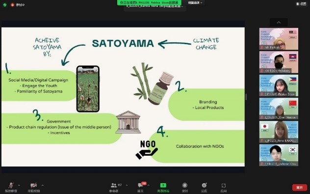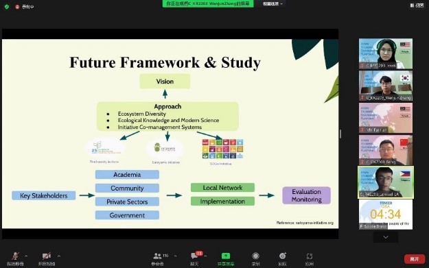 在为期三天的线上活动中,来自永旺财团(AEON Foundation)、早稻田大学等研究机构的专家学者对构建“里山”社区、景观和产品等课题进行了讲演,报告内容涉及“里山”理念的起源及其在日本的实践案例、现代生活中保留社会生态景观的方法探讨与展示、朱鹮保护和佐渡岛生态实验案例等。在员工讨论环节,各国员工围绕不同国家和不同民族的“里山”文化、保护“里山”所必须的现实条件和社会支持等问题展开了热烈讨论和交流。8月4日下午,各组员工对于“里山的未来继承”这一主题进行了最终报告展示。同学们就“里山”这一人与自然和谐共生的理念如何进行继承和现代化、科技化的改进,如何从“里山”理念出发,应对气候变化、环境污染等现实问题,从不同专业的视角提出了多种多样的方案。