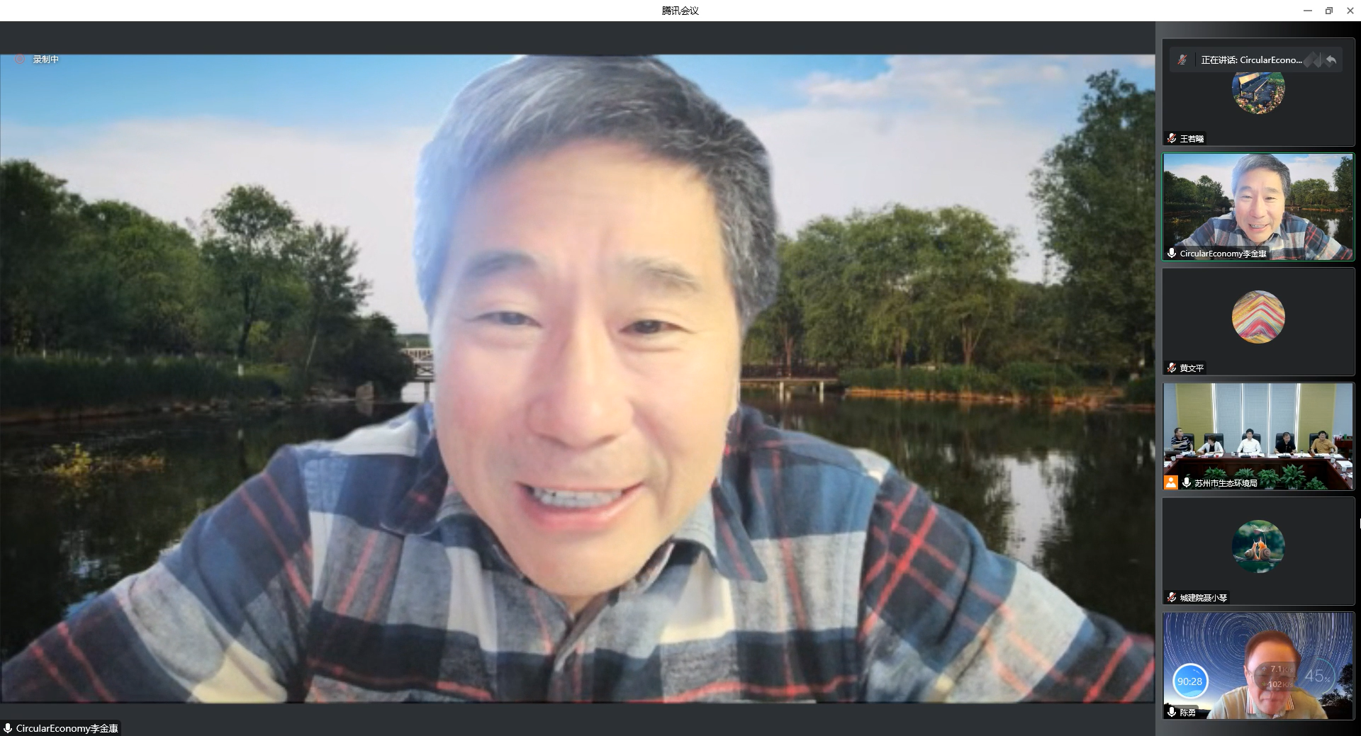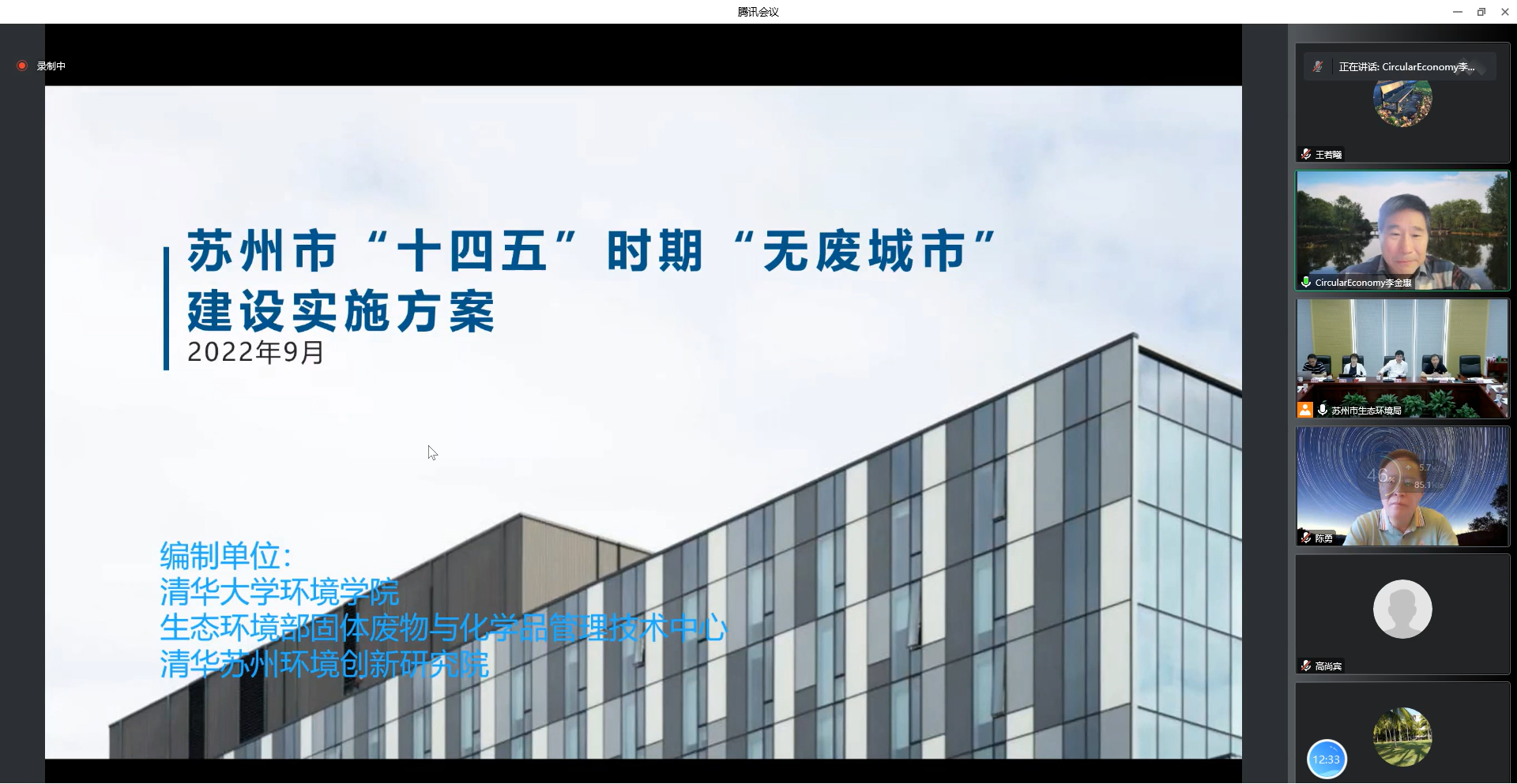 李金惠作为项目负责人汇报了《实施方案》的具体内容。《实施方案》详细梳理了苏州市一般工业固废、生活垃圾、建筑垃圾、农业废弃物以及危险废物等五大类固体废物管理现状,提出了“十四五”时期苏州市“无废城市”建设目标,主要任务,重点工程和制度、技术、市场、监管四大体系建设内容,立足苏州工业制造强市和江南历史文化古城定位,构建无废工业制造体系、无废农业生态体系、无废园林文旅体系、无废创新制度体系、无废家园智慧体系,具有鲜明的地域特色。