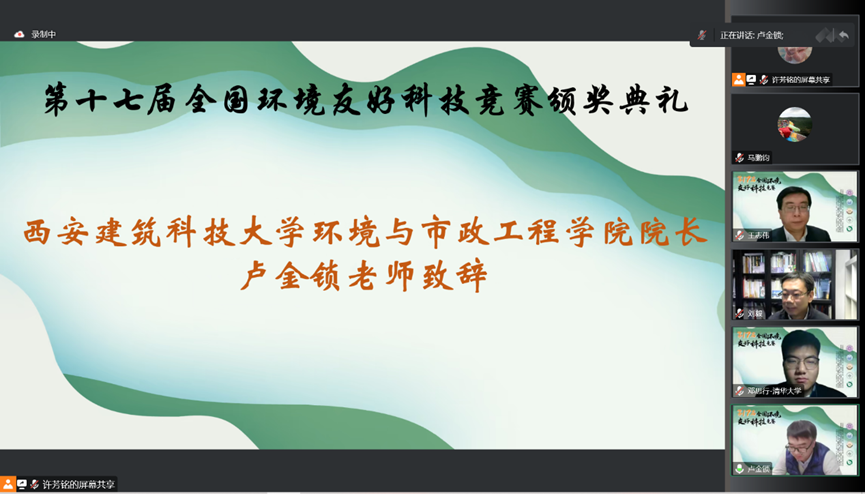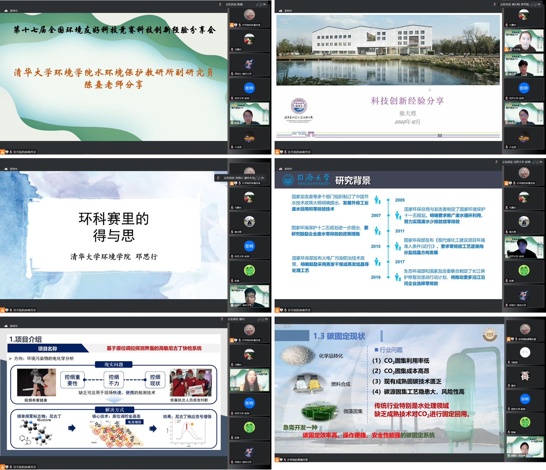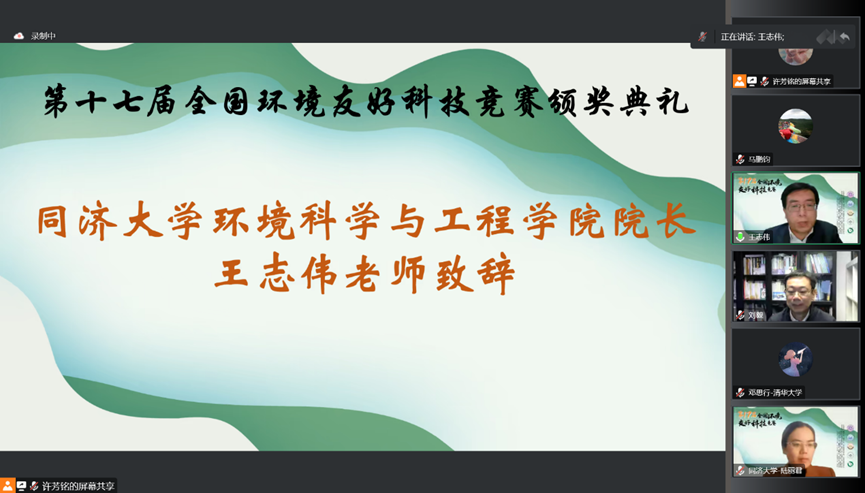 本届环科赛优秀团队同济大学《基于多源驱动的清洁-可持续废液零排放处理系统》项目团队、《基于原位调控探测界面的高敏尼古丁快检系统》项目团队及西安建筑科技大学《探析碳循-工业碳源固集与循环利用推进者》项目团队分别介绍了获奖作品和参赛经验。