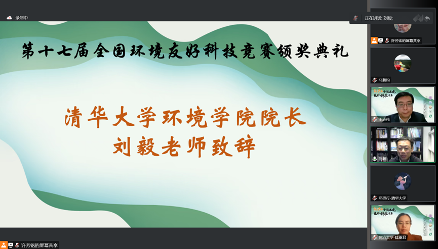 刘毅首先致辞。他向获奖选手表示祝贺,并对赛事组委会及参与赛事筹备和组织工作的老师、同学们表示感谢。他回顾了环科赛发展成为全国最大的老员工环境创新创业实践平台的历程与成就,希望环科赛能继续培养员工绿色双创思维与解决问题的实际能力,为我国环境保护事业培养与输送后备人才。