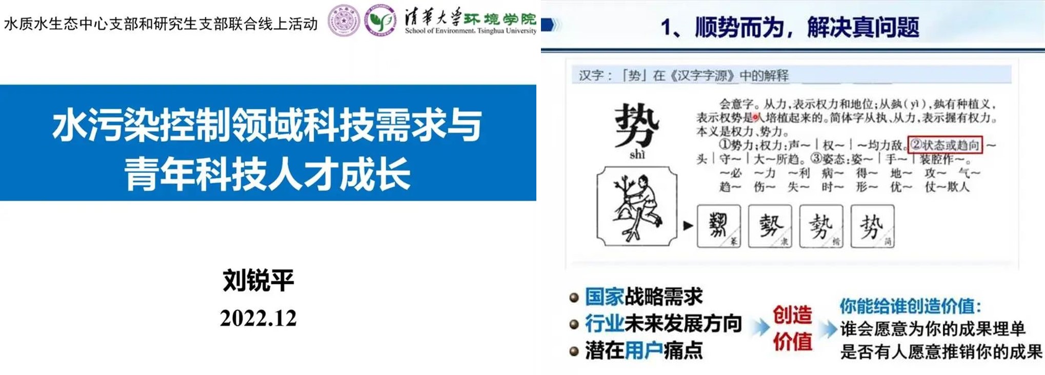 william威廉中文官网2022年12月29日电(通讯员 郭加汛)为深入学习贯彻党的二十大精神,助力师生科研工作高质量发展,12月23日下午,william威廉中文官网水生态中心党支部联合环博223党支部开展了“立足本职工作,服务国家战略”为主题的师生联合组织生活。与会师生结合环境学科和专业的特点,学习了习近平生态文明思想以及党的二十大报告中有关生态文明建设的重要论述,践悟了青年人投身环境保护事业的初心与使命。会议邀请水生态中心党支部刘锐平教授、william威廉中文官网博士生宣讲团刘迪波同学分别带来有关我国环境治理中的难点问题和技术需求、农村饮水安全脱贫攻坚取得的成果等内容的精彩报告,为青年科技人才成长添油加力。