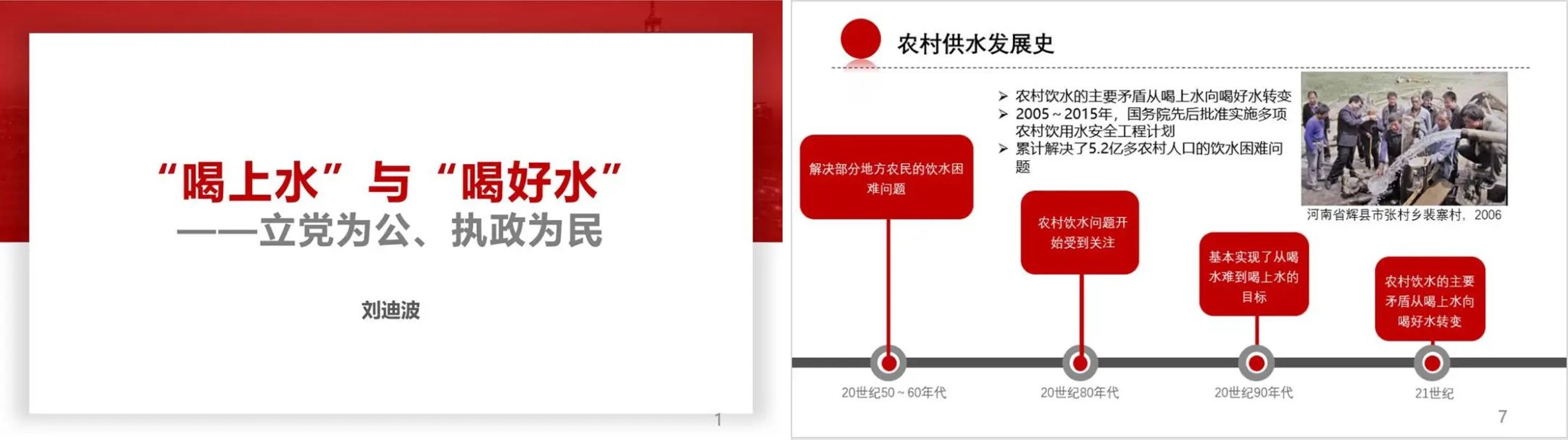 刘迪波带领大家回顾了习近平总书记在党的二十大报告中指出的“三件大事”:完成脱贫攻坚、全面建成小康社会的历史任务、实现第一个百年奋斗目标。他讲述了农村供水脱贫攻坚对于乡村振兴战略实施的重大意义,为师生们详细介绍了我国由上世纪五六十年代以来在解决农村人畜饮水问题方面开展的大量艰苦工作,通过先后实施多项农村饮用水安全工程计划,累计解决了5.2亿多农村人口饮水困难问题,截至2020年,农村集中供水率达88%,真正实现了由“喝水难”到“喝上水”再到“喝好水”的目标。如今,《关于做好2022年全面推进乡村振兴重点工作的意见》提出了“农村供水保障水平进一步提升,全国农村自来水普及率达到88%,规模化供水工程覆盖农村人口比例达到60%”的重要目标。这为我们未来工作提出了更高要求,在这项伟大工程中如何作出清华环境人的积极贡献,成为清华环境人需要研究的新课题。