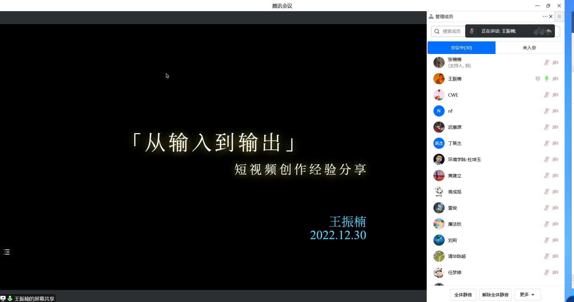 王振楠以“从输入到输出——短视频创作经验分享”为题,结合自己创作短视频的典型案例,围绕短视频制作的流程,从脚本撰写、拍摄过程、素材剪辑等方面,通过丰富的实例生动、细致地讲解了短视频创作的思路、技巧和注意事项,并分享了个人进行短视频创作的经验。他表示,短视频创作要抓住热点问题,找到受众的“痛点”与“爽点”;要注重脚本撰写,不打无准备之仗;要转换视角,多从受众角度增强代入感;拍摄过程中要注重画面的清晰与稳定,同时尽量多角度拍摄,以丰富视频内容;视频剪辑时要注意画面的转换与衔接,要多总结摸索经验。