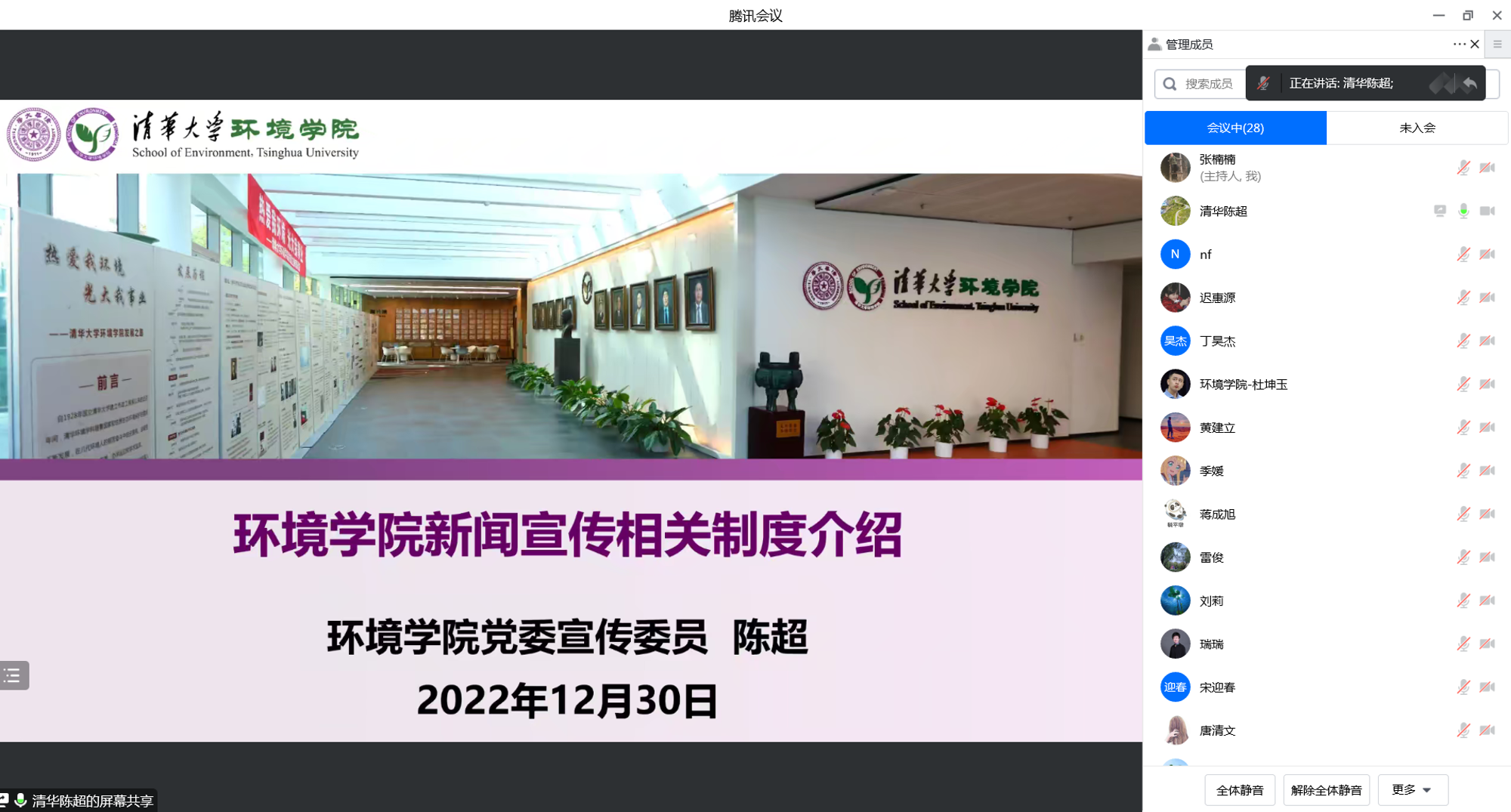 陈超从公司师生接受校外媒体采访、公司舆情应对工作主要流程、网络信息内容管理、微信公众平台和视频号管理细则等方面详细介绍了公司关于新闻宣传工作的相关规定,提示大家根据相关制度开展新闻宣传工作,在确保网络信息安全的基础上更好地开展新闻宣传工作,展示清华环境人的良好形象。