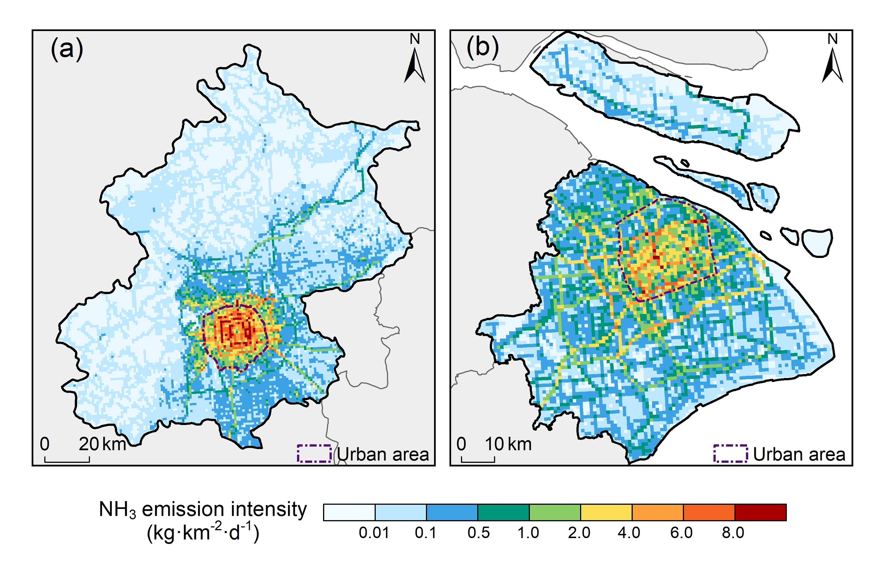 图2 北京和上海机动车NH3排放强度空间分布特征