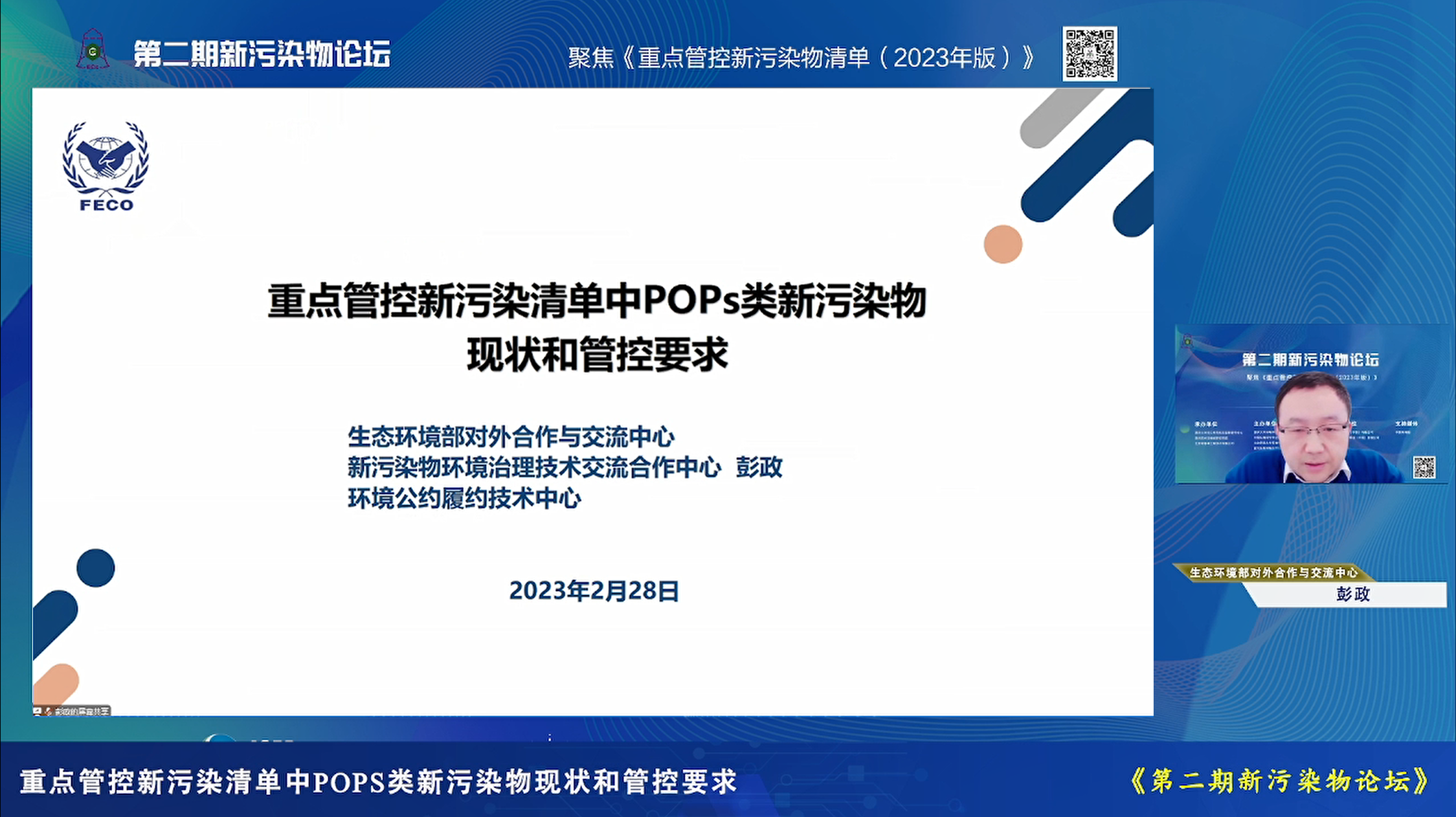 生态环境部对外合作与交流中心彭政正高级工程师介绍了重点管控新污染物清单中POPs类新污染物现状和管控要求。他详细介绍了POPs类新污染物现状和管控情况,并指出,《清单》服务于新污染物治理行动方案,是不断动态更新的。而新污染物治理目标与斯德哥尔摩公约的履约目标是一致的。