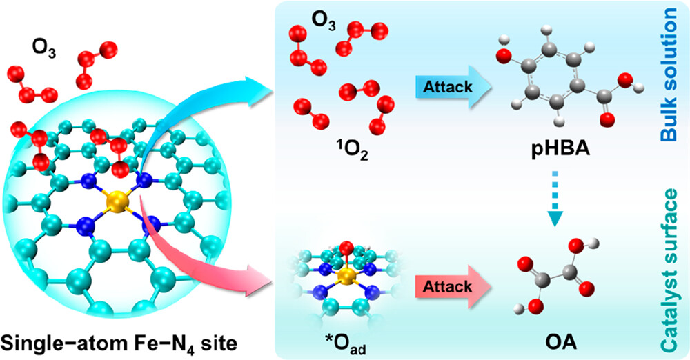 不同于传统自由基氧化,单原子Fe-N4位点催化臭氧可选择性生成吸附态原子氧(*Oad)和单线态氧(1O2)等非自由基物种,同时观察到非自由基对水中污染物的去除具有底物依赖特性:OA容易吸附到催化剂表面,从而被表面*Oad降解,pHBA则主要被溶液中的O3和1O2去除。研究采用密度泛函理论计算和分子动力学模拟从原子水平展示了*Oad和1O2非自由基的演化路径,即臭氧分子的一个端氧原子倾向于与Fe-N4位点的中心铁原子结合,进一步诱导靠近催化剂表面的O-O被拉长并发生断裂,形成*Oad和1O2非自由基。这项工作为臭氧催化剂的结构设计以及原子级水平理解催化臭氧产非自由基过程提供新思路和新方法。