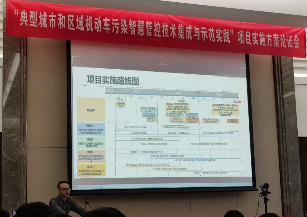 中国工程院院士贺泓主持项目实施方案论证会。论证专家组由中国科公司生态环境研究中心贺泓院士、中国环境科学研究院柴发合研究员、中国环保产业协会易斌研究员、长安大学王元庆教授、北京师范大学田贺忠教授、军事交通公司资新运教授、北京航空航天大学朱天乐教授、成都机动车环保技术有限公司田红教授级高级工程师、深圳市环境科学研究院颜敏研究员组成,贺泓担任组长。