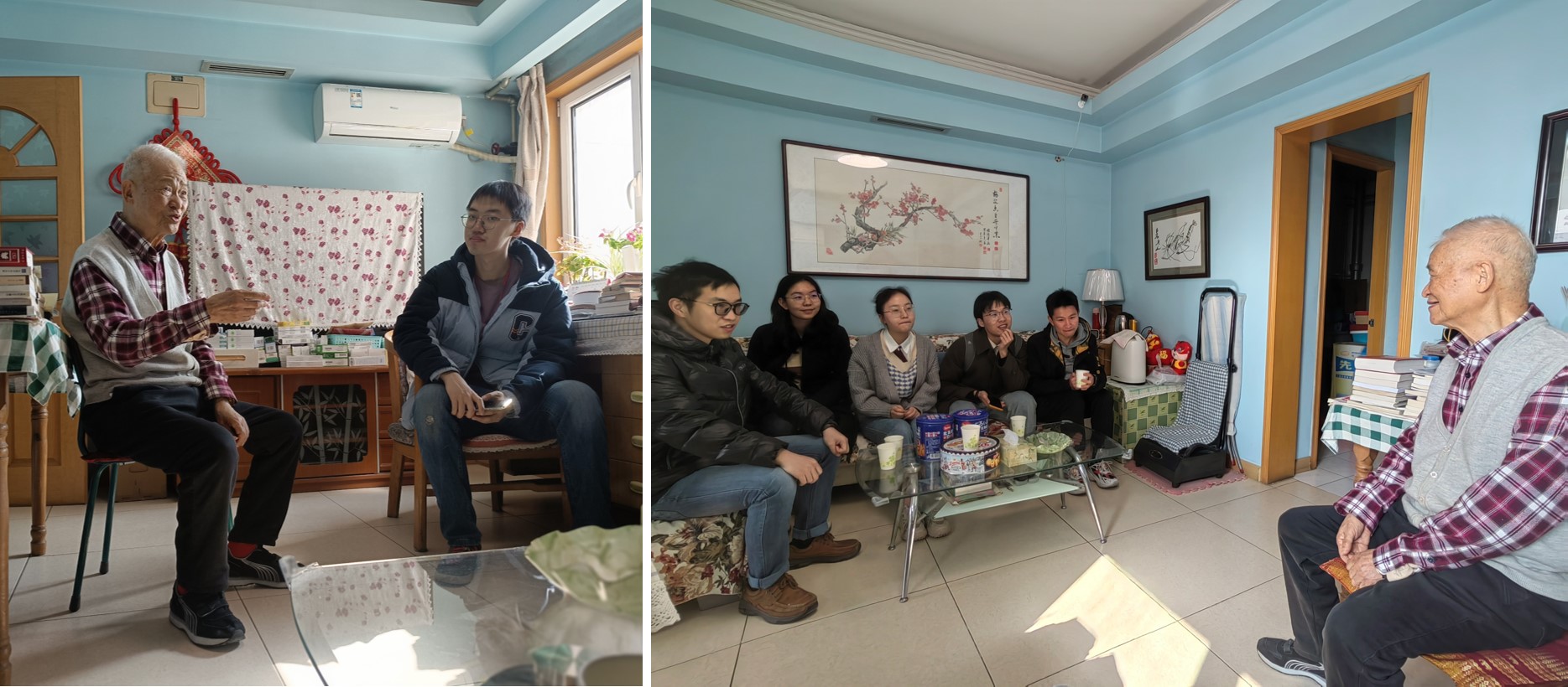 随后,马克思主义公司退休教师宋秦年教授邀请研究生志愿者前往住处参观、交流。他向大家讲述了自己在土木系学习以及在人文公司、马克思主义公司的工作经历。宋秦年老师虽然已经八十多岁了,但始终关心国家发展并坚持用文字表达出自己的观点与想法,也一直在社区向大家讲授党课,始终在其研究领域发光放热。他还向志愿者展示了自己的书法作品,介绍了他丰富多彩的退休生活。志愿者们也向宋秦年老师提出了一些关于自然科学与社会科学等方面的疑问,宋老师结合自己在自然科学与社会科学两方面的学习和工作经历,向志愿者们详细讲述了自然科学与社会科学的互通性问题,耐心、细致地解答了同学们的问题。