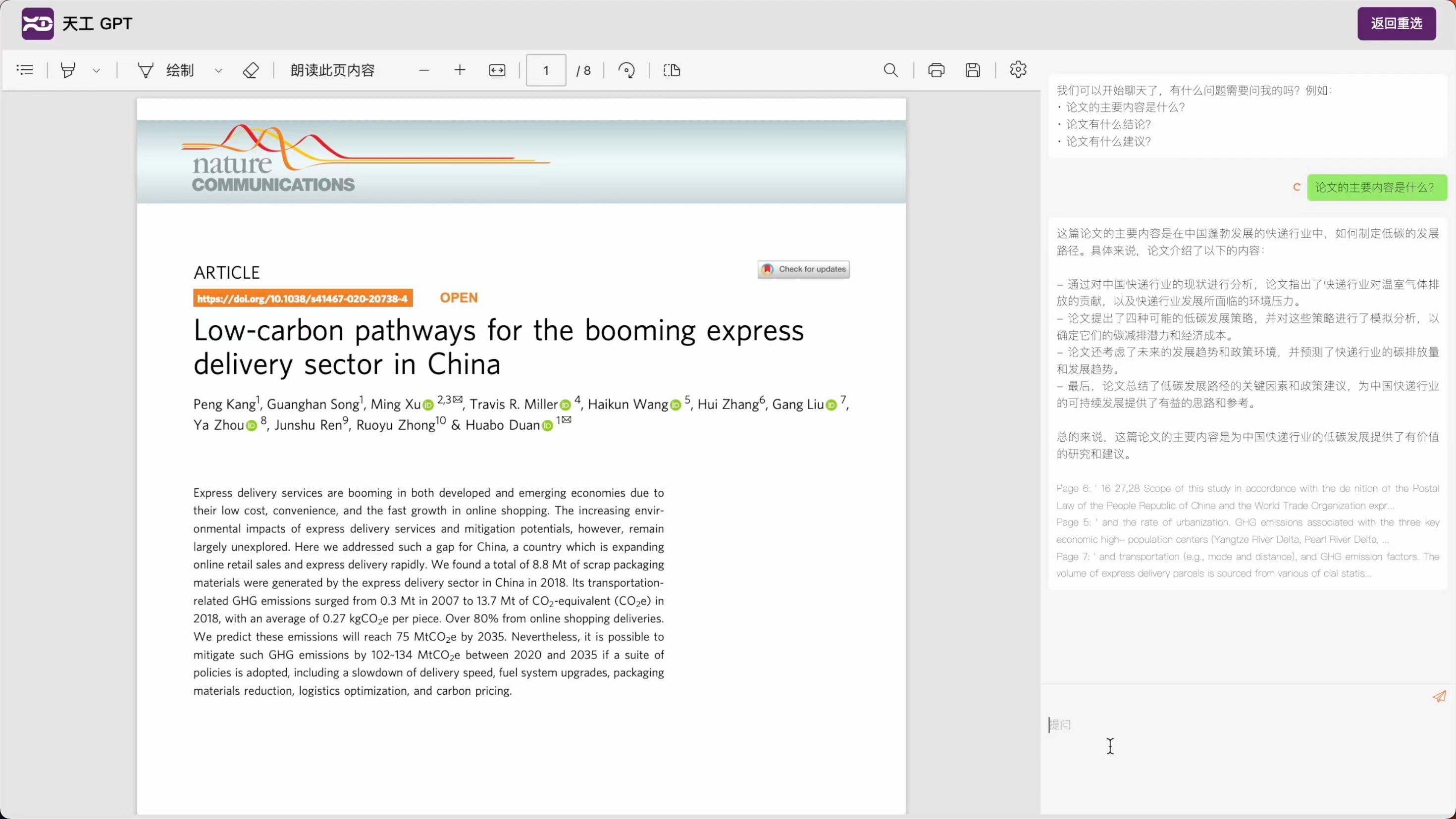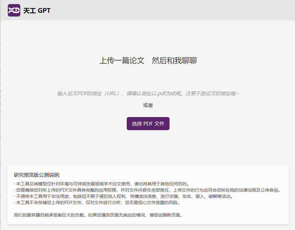 天工GPT基于生成式预训练模型(GPT)研发,专为环境与可持续发展领域学术论文研究设计,基于不限语言的聊天式交互,可以帮助研究人员快速获取论文的主要内容、创新点、研究方法、数据来源等信息,以及论文的贡献、局限和未来研究方向,提升关键信息提取效率。天工GPT的使用非常简便,用户只需选择论文的PDF文件、等待文件解析后,便能够以聊天的形式与模型互动获取信息。天工GPT支持多种语言聊天,并可以混合多语言提问,并以提问的主要语言进行回应和反馈。