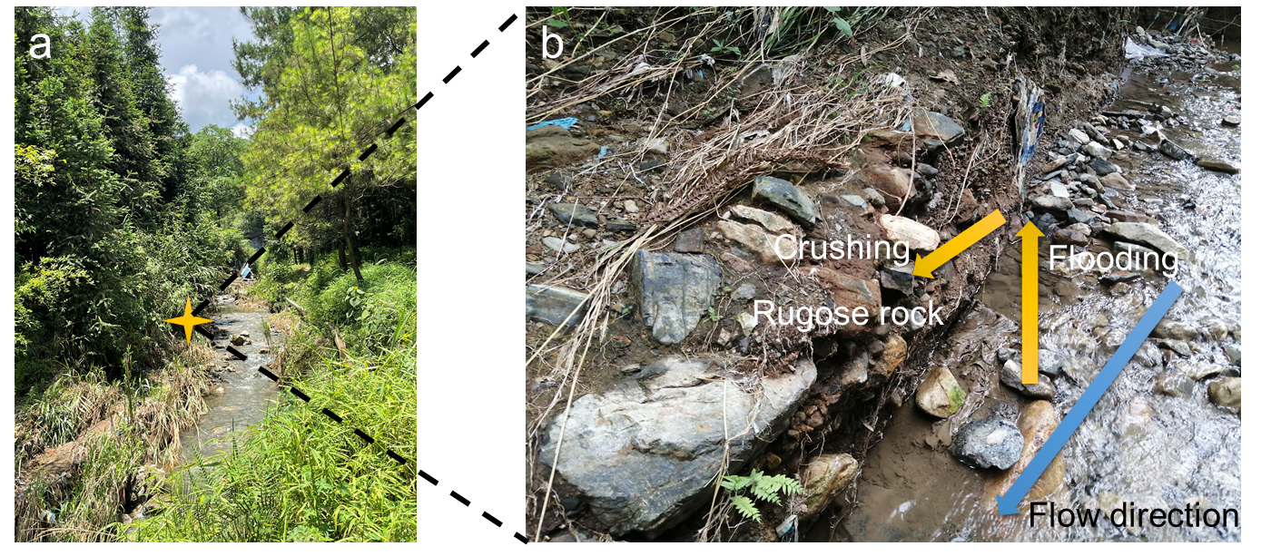 研究团队在西南地区开展野外工作时,偶然发现了塑岩,其塑料组成包括低密度聚乙烯(LDPE)和聚丙烯(PP),其粘附的沉积岩的主要矿物成分为石英。结合塑料厚度、氧化程度与当地土地利用类型推测,LDPE与PP分别来源于农膜投加与一次性塑料袋使用。根据周边的水文和地质、土壤等条件推断,历史洪水泛滥,携带上游塑料冲刷、撞击多棱角的岩石,是塑岩形成的前提条件(图2)。