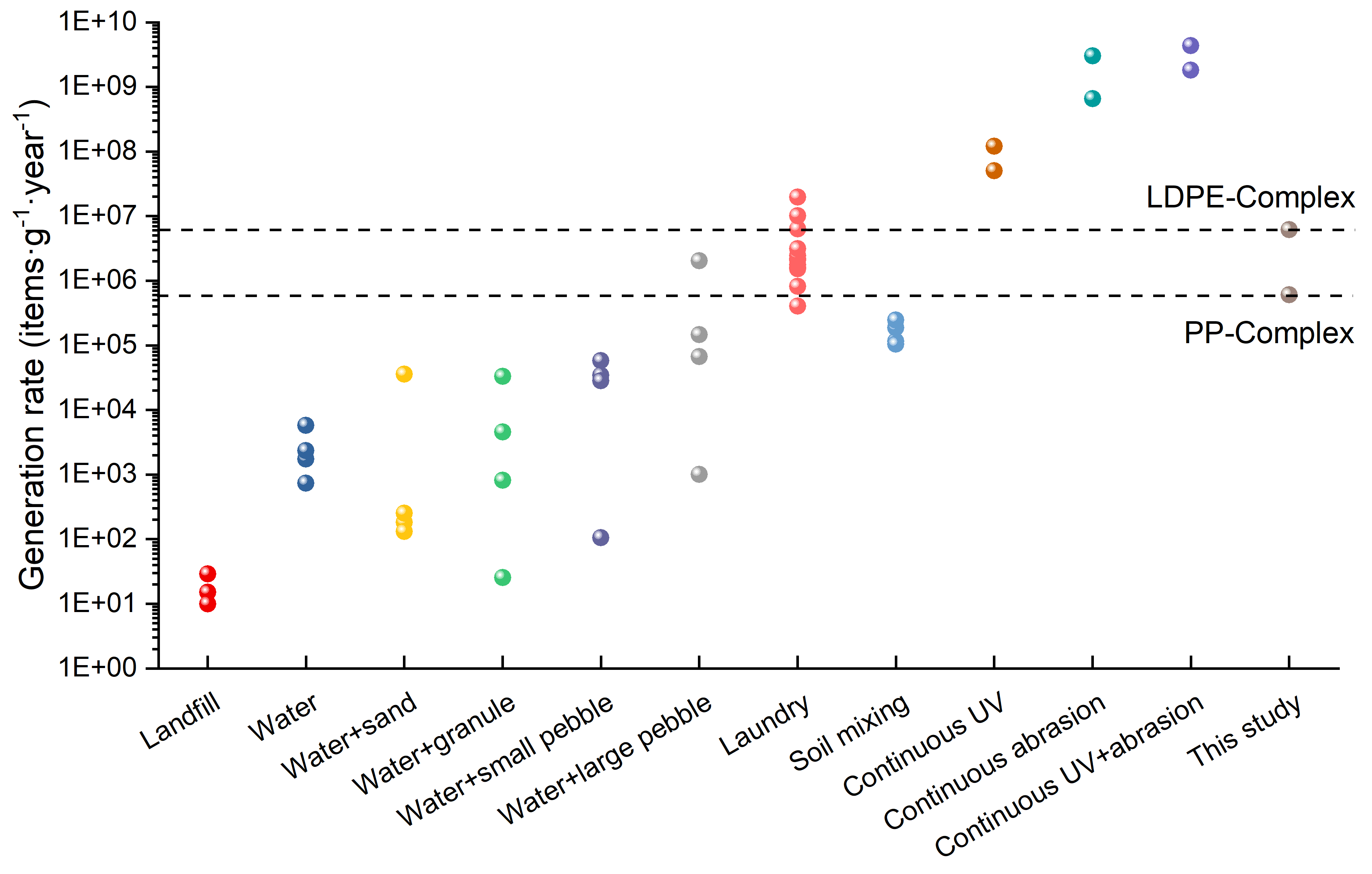 研究团队在实验室内通过干湿循环实验,探究了塑岩释放微纳米塑料的能力。与利用吹膜法制备的相同厚度塑料薄膜相比,相同循环次数下塑岩中的LDPE和PP可释放更多微塑料颗粒。微塑料的释放过程遵从零级动力学,显示出持续的微塑料释放能力。10次干湿循环过程中,LDPE与PP分别可累积释放1.03×108个/m2、1.28×108个/m2微塑料颗粒(图4),其释放速率比文献报告的垃圾填埋场、海洋环境下微塑料的释放速率高2个数量级以上(图5)。除此之外,干湿循环同样造成了纳米塑料的释放。NTA表征结果显示,单次干湿循环即可从塑岩结合的LDPE与PP中释放4.20×1012个/m2,9.01×1012个/m2纳米塑料颗粒(图6)。在全球变化的大背景下,洪水泛滥事件造成的干湿循环频次增加,这一塑料的赋存形式与其它赋存形式相比,存在较高的生态风险。这一发现是塑料这一人造材料进入自然界地质循环过程的直接证据,阐释了塑料制品在环境中一种新的风险机制与归趋。