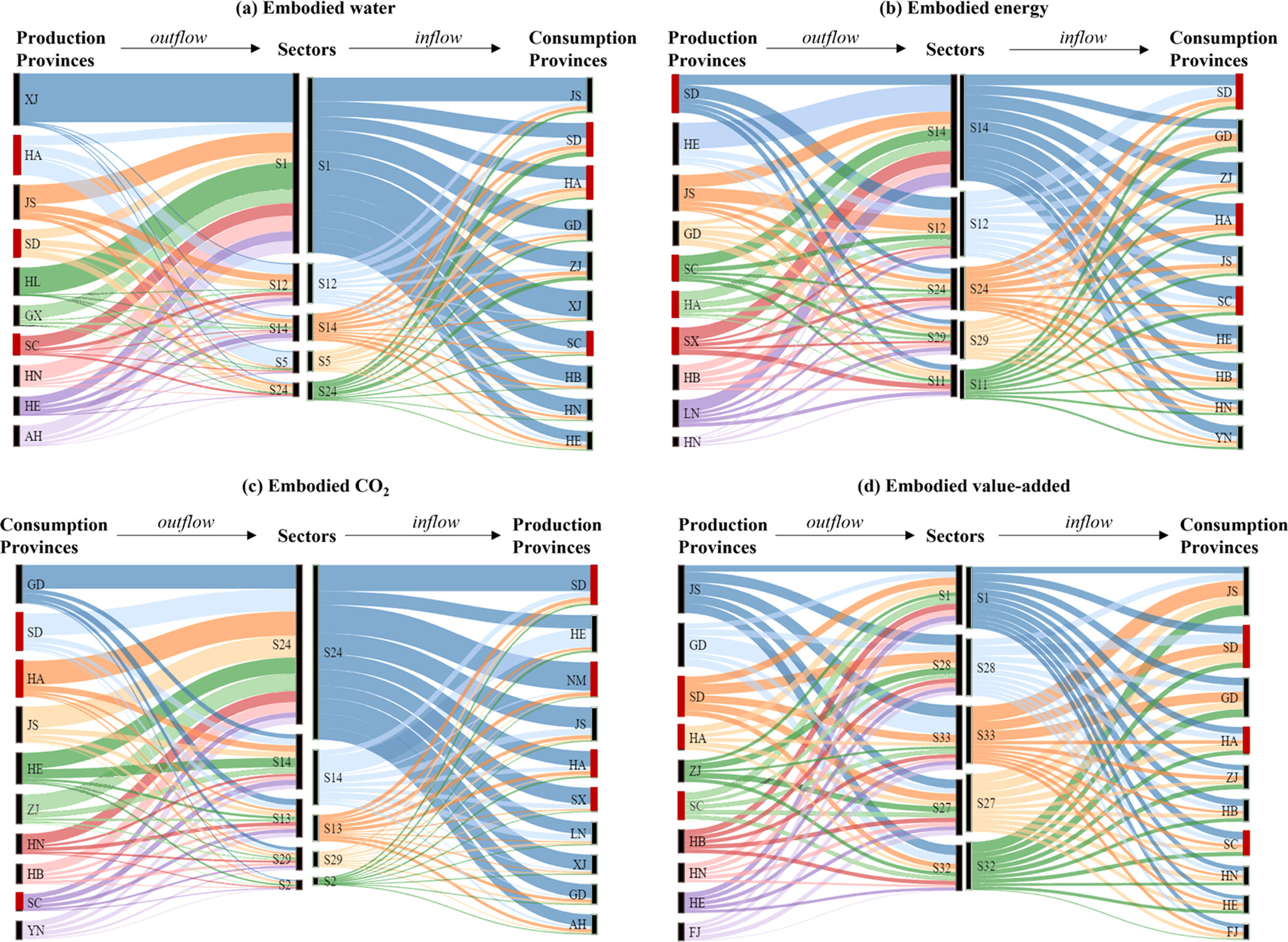 图3. 水-能-碳-增加值隐含流行业-省份间关联