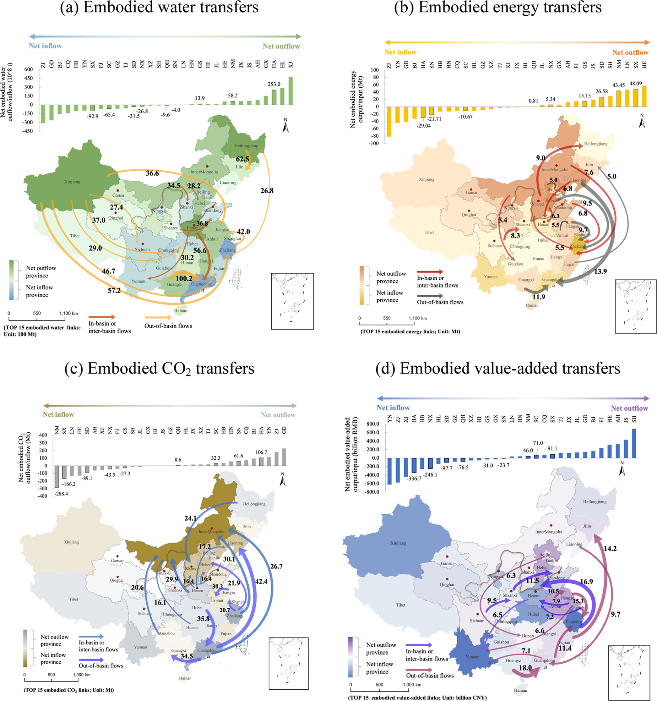 图2. 中国省际间隐含水、能源、碳和增加值转移格局