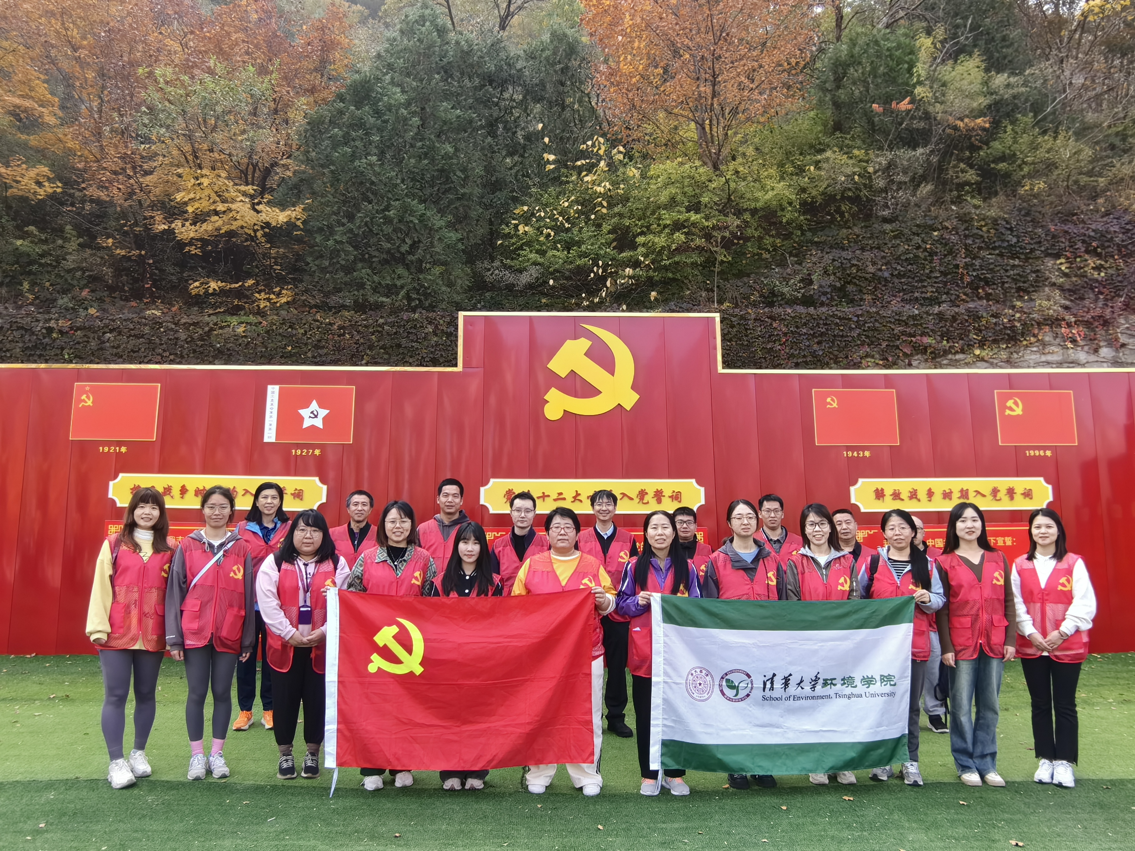 追忆长征历史。走在青龙峡文化长廊,党员们追忆了血战湘江、四渡赤水、巧渡金沙江、飞夺泸定桥、草地徒涉、北上会师等长征历史事件,并且在专业老师的带领下开展了以飞夺泸定桥、重走长征路、北上会师历史故事为背景的沉浸式情景体验活动。在飞夺泸定桥环节,水环境所党支部书记张潇源带领大家在“敌人”的重重围攻下,一步步通过传递木板艰难度过了桥面;在北上会师环节,“中国工农红军第一军”和“中国工农红军第二军”庄严会师,并互相授旗,再一次深刻领悟了革命先辈们忠诚于党、矢志不移的坚定信念和不怕牺牲、顽强拼搏的革命精神;在重走长征路环节,旗手高高举旗,红旗迎风飘扬,大家怀着崇敬的心情,体会着红军当年浴血奋战、向死而生的革命精神。
